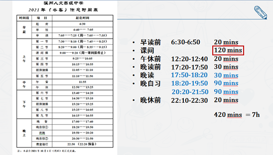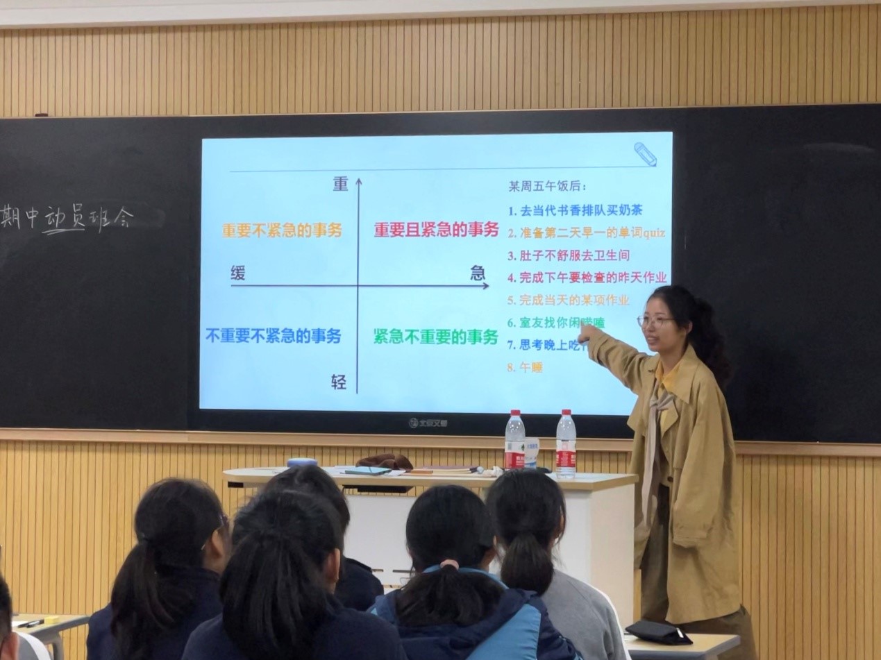 课堂第一部分的讨论焦点是期中考时间安排。班主任早在前一次的阶段性测验后就让同学们写下反思和计划,培养学生们自省和提前规划的习惯。在本堂课上,老师先让学生们自我检查前一周的计划完成情况,而后展示了部分同学的具体计划与完成情况分析,带领大家共同讨论碎片化的时间应该如何去利用。通过学校作息时间表的展示,老师和同学们一起找出可支配的碎片化时间并整合叠加,学生们惊叹一天内被自己无意识浪费的时间竟是如此大的数目。